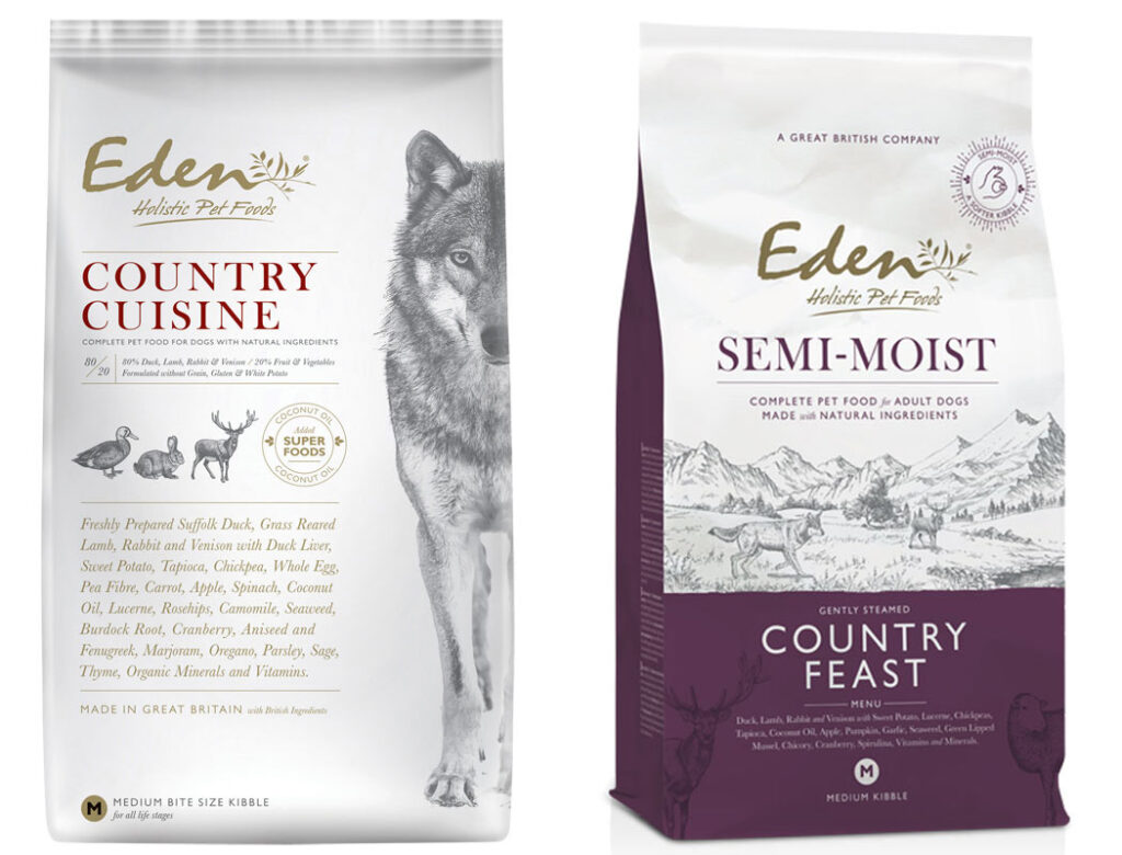 Karma Eden Country Cuisine – karma bezzbożowa o wysokiej zawartości składników mięsnych (80%) z kaczki, jagnięciny, królika i dziczyzny. Zadowalająca najbardziej wybredne psy. Może być podawana psom nie tolerującym mięsa kurczaka.